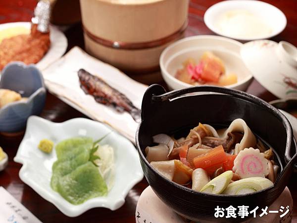 餐點包括使用當地時令食材,料理的豐盛餐點。可以品嘗到新鮮的河川魚、蔬菜和尾瀨豆腐等健康美食。