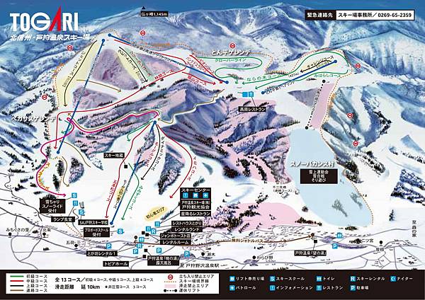 「戶狩溫泉滑雪場」以其豐富多彩的路線而吸引人,以及北信州最好的粉雪,從初學者到高級滑雪者路線在這裡都可以滿足享受到!