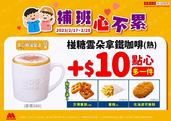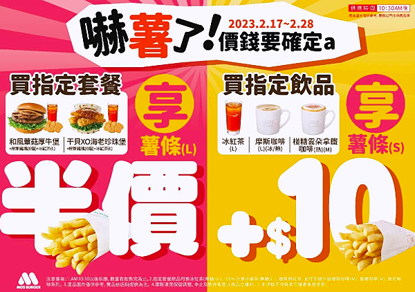 凡消費大杯冰紅茶或摩斯咖啡,可以10元優惠價加購小包薯條一份