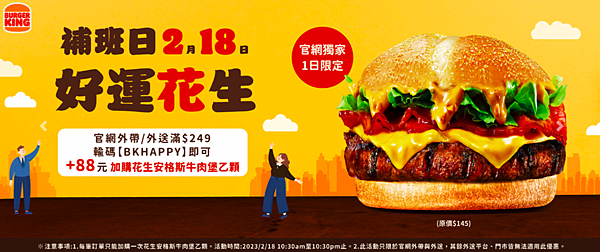2月18日補班日於漢堡王官網外帶或外送滿249元